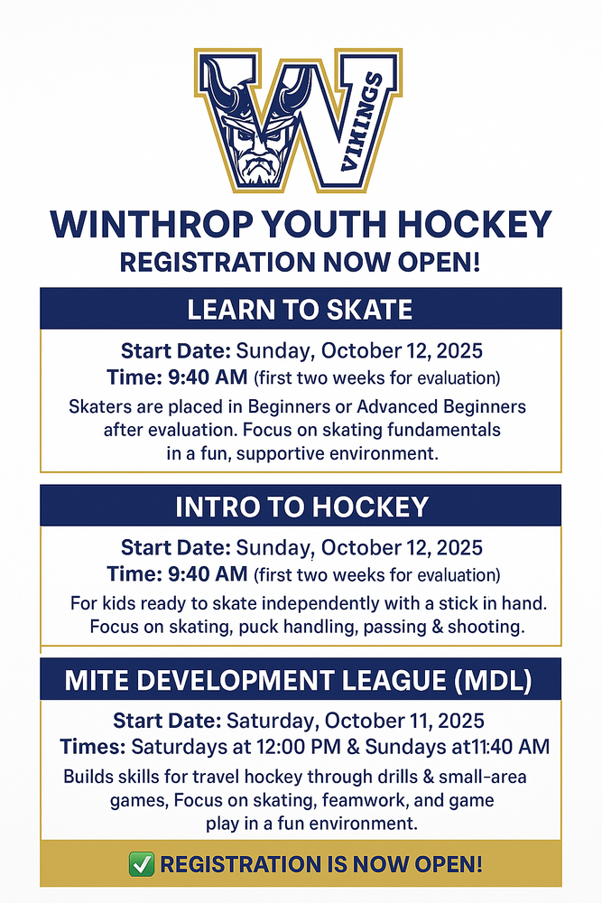 At Winthrop Youth Hockey (WYH), our mission is to provide a fun, safe, and supportive environment where kids can develop their skating and hockey skills, build confidence, and grow as teammates both on and off the ice.